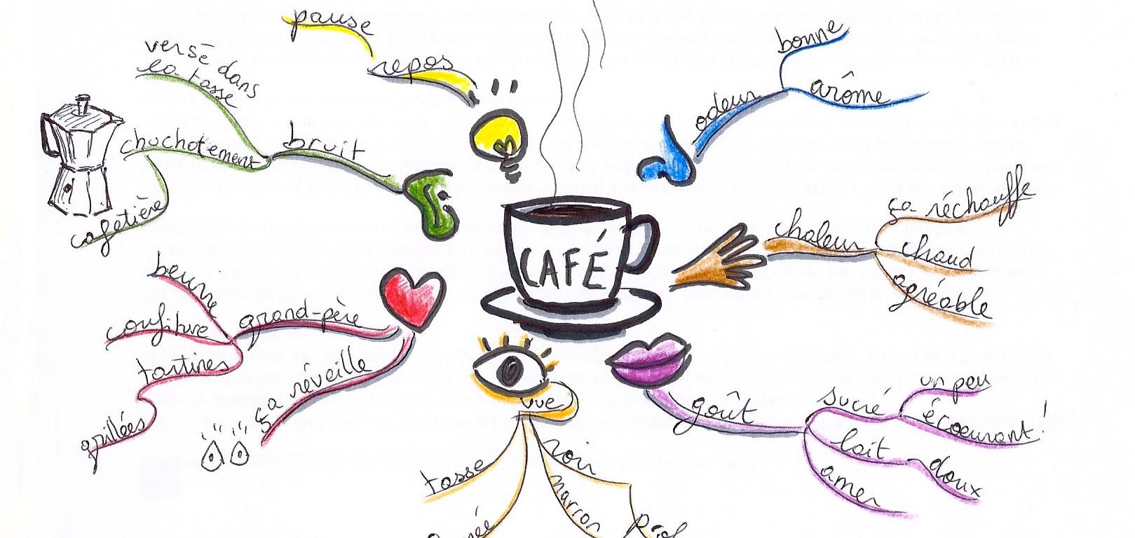 Si on demande à quelqu’un de nous décrire le café par exemple, il y a de grandes chances pour qu’il nous réponde par les mots habituels : « noir, amer, sucré, chaud ». Pour « colorer » un peu plus la description et enrichir le lexique de cette personne, connectons-là à ses sens ! cafe