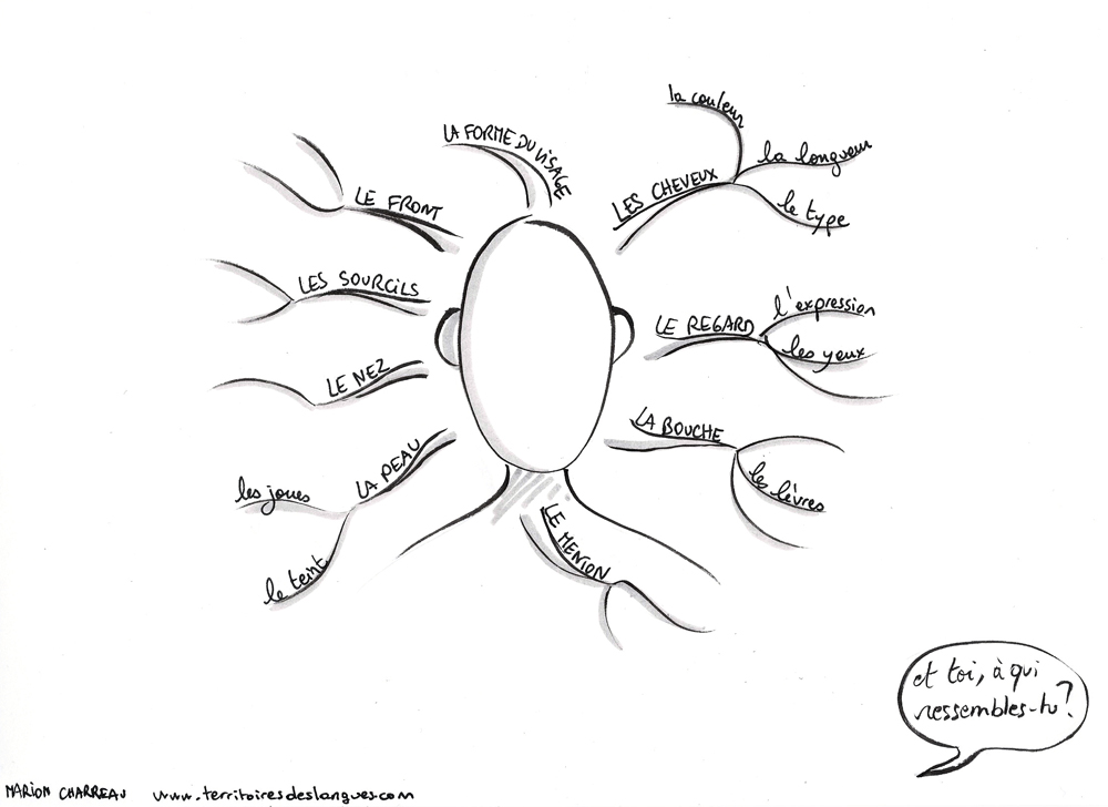 Voici une carte qui peut nous aider à faire ce travail en nous guidant dans nos observations et notre analyse. J’ai laissé la place d’écrire des mots autour du visage (nez, bouche, front, etc.) si nécessaire. Le visage est à personnifier également.description0