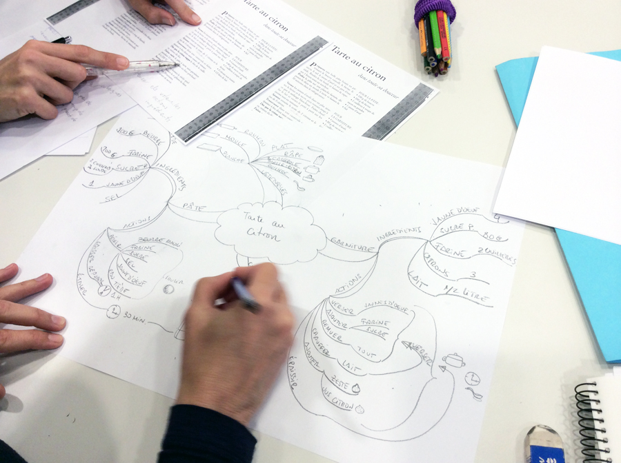 L’avantage de la carte c’est que l’on conserve une vision globale de tout ce qui est nécessaire à la préparation (ustensiles, ingrédients) et on peut relier les différentes tâches entre elles. En réalisant ce travail, les élèves s’approprient la recette, la carte est l’aboutissement d’un travail de construction et le reflet de leur compréhension.