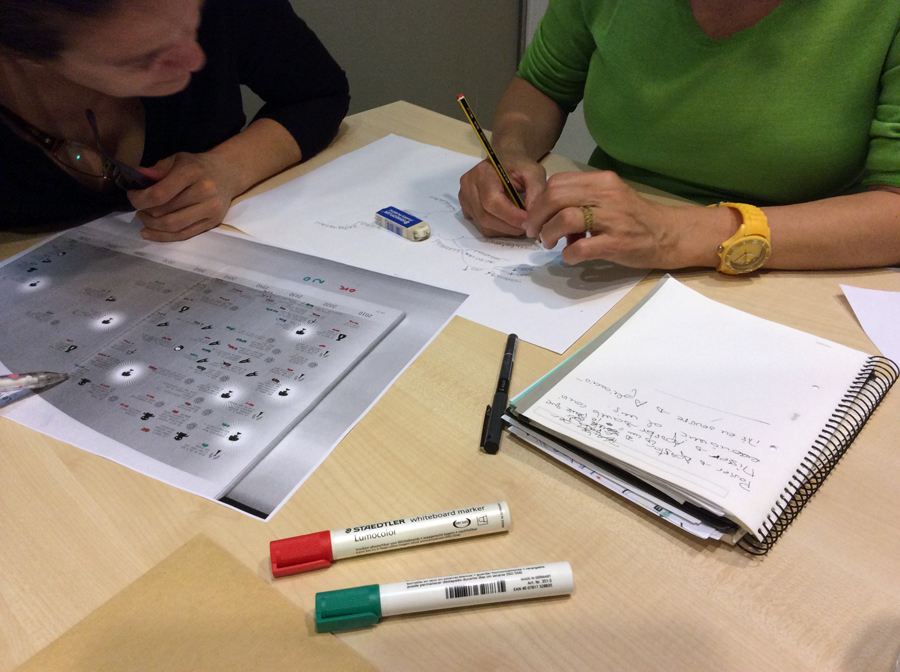 Le travail d’analyse a été largement facilité par la nature du document qui spatialise l’information, mais aussi par la reconnaissance visuelle des éléments (avec des couleurs ou des formes). Ensemble nous avons identifié les axes suivants :