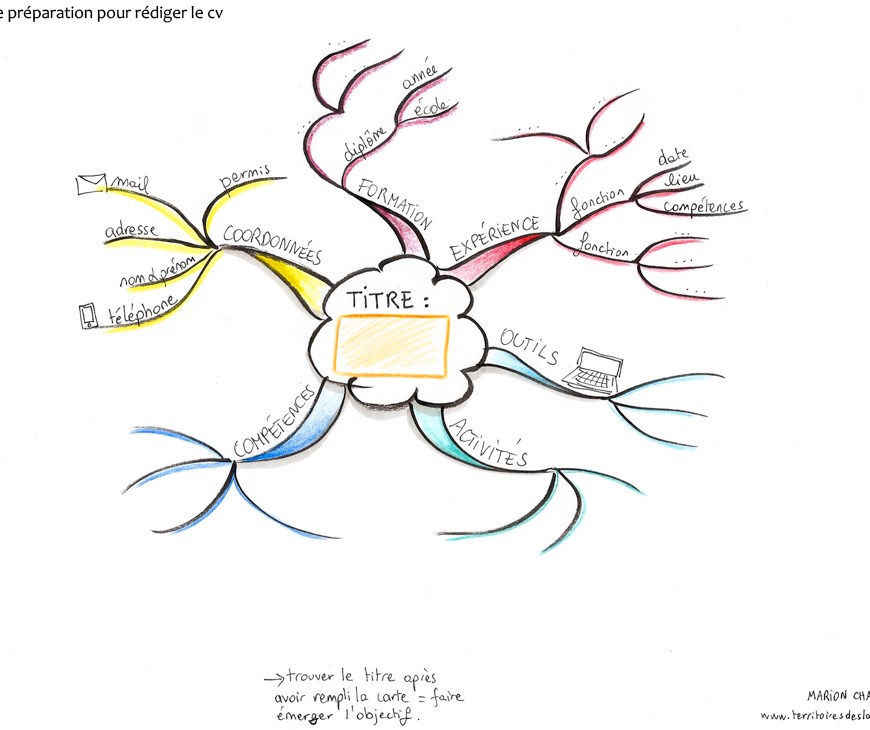 Revenons un peu à la carte heuristique. Sur le forum du MOOC Travailler en français certains ont eu une bonne intuition : « Les cartes peuvent-elles nous aider à bien rédiger une lettre ? qu’en pensez-vous ? » « Et pourquoi pas une carte heuristique de motivation ? » Donc je me suis mise au travail pour trouver des réponses, et cela pouvant aider beaucoup de monde, autant les … Continuer de lire Préparer un CV et une lettre de motivation à l’aide d’une carte heuristique